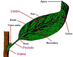 Hoja simple: la lamina no esta dividida en segmentos individuales de tal manera que a una yema axilar corresponde una lamina foliar. En una hoja simple tipica distinguimos las siguientes partes: Lamina o limbo, que es la parte principal plana y ancha de la hoja, a la cara de encima o cara superior del limbo( generalmente brillante y mas oscura) se le llama haz. a la cara de abajo o cara inferior ( generalmente opaca y mas clara) se le llama envés.